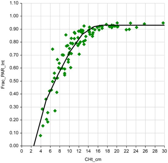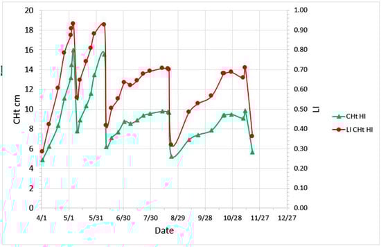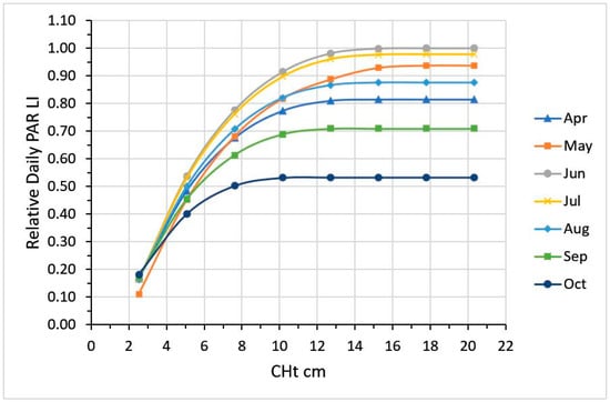 As canopy height increased, LI increased to a CHt of 17 cm, plateauing at 0.93 of ambient PAR (Figure 3). Across the growing season, LI exceeded 0.90 only in the first and second growth periods, and for other periods ranged from 0.30 to 0.70 (Figure 4).