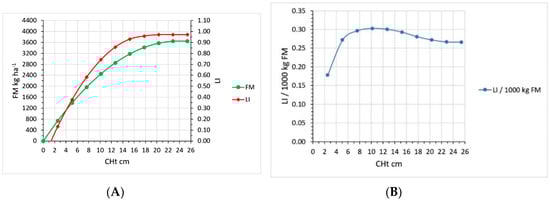 Both LI and FM increased with sward height (Figure 5A); LI reached a peak at a CHt of 18 cm (30 cm RHt), and FM reached a peak at a CHt of 23 cm (38 cm RHt). The efficiency of LI per unit FM was low at a CHt below 8 cm (13 cm RHt), peaked at 10 cm (17 cm RHt), then decreased as CHt increased to 25 cm (42 cm RHt) (Figure 5B).