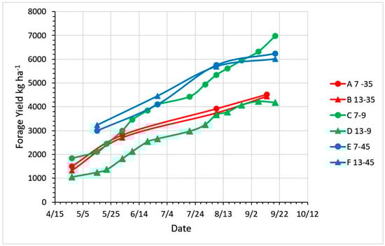 In a 2-year comparison of continuous stocking, rotational stocking (2 days of grazing monthly to 15 cm residual sward height; six grazing cycles) and haymaking (two cuts) on mixed cool-season grass-legume pasture, Oates et al. [] observed higher potential season-total utilizable forage under rotational stocking than under continuous stocking and haymaking (11,500, 7250, and 7750 kg DM ha−1, respectively). Root masses from 15 cm deep in-growth cores sampled each October were higher for haymaking than for rotational and continuous stocking (2000, 1250, and 950 g m−2, respectively) in one year but not different in the second year (2600, 2500, and 1700 g m−2 for haymaking, rotational and continuous stocking, respectively). While these treatment responses differ from ours, Hart et al. [] found in a 3-year comparison of orchardgrass and tall fescue, clipped weekly to 5, 10 or 20 cm RSH or every 28 days to 5 cm RSH, that total-season forage mass was higher for monthly clipping at 5 cm than for weekly clipping at any height. Within weekly clipping treatments, season-total forage production decreased with increasing RSH, which is consistent with our results for simulated continuous stocking at 7 vs. 13 cm RSH (Treatments C and D, Table 3 and Figure 6).