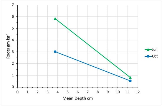 Root mass at mean soil depths for samples taken at 0 to 7.5 and 7.5 to 15 cm depths. Each data point represents the mean of 18 samples.