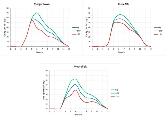A plant growth model based on local weather history and a Penman-type evapotranspiration model was used as a stochastic model to evaluate the impact of variations in weather on FGR in three climatic zones of the Allegheny Plateau and Northern Appalachian Ridges and Valleys (Table 5). This model uses inputs of latitude, day of the year, daily rainfall, and daily maximum and minimum temperature []. Potential evapotranspiration (PET) is calculated as a function of potential solar radiation for the day of the year [], modified by estimated cloud cover based on the daily temperature range (maximum minus minimum temperature). Calculated PAW in the rooting zone is the sum of the previous day’s PAW plus daily rainfall, minus PET. The effect of PAW and air temperature on the growth of cool-season forages was used to modify the expected FGR. This model was field tested using within-pasture weather and clipped forage production over 16-site years. The model’s predicted growth compared to clipped forage growth had an R2 of 0.81 and a residual SD of 964 kg ha−1 across the growing season.