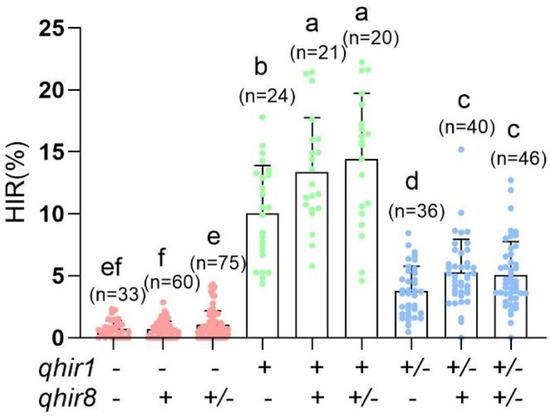 Nine genotype classes were obtained because of the combination of qhir1 and qhir8. The plants from these genotype classes were crossed with ZD958, an elite hybrid used to evaluate the HIR. The results (Figure 1) revealed that the HIR of the plants that were absent at qhir1 ranged from 0.70% to 1.04%, which was significantly lower than either those that carried a heterozygous qhir1 allele or those that carried a homozygous qhir1 from inducer, with HIRs of 3.77% to 5.27% and 10.02% to 14.42%, respectively. Moreover, the HIR increased significantly, 3%–14%, when the MAS was carried out with both qhir1 and qhir8.