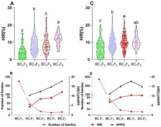 Selection response on the number of families, HIR, and number of haploids per ear (NHPE) for the different generations. More than three numbers of ears were used to calculate the HIR and NHPE, and a Tukey’s honestly significantly different (HSD) test was performed to identify the difference among the different selection generations. (A) and (B) correspond to the population of CAU3; (C) and (D) correspond to the population of CAU5.