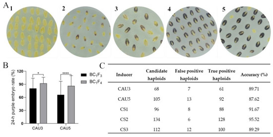 (A) Classifying the color of immature embryos. (B) Comparison of the 24-h purple embryo rate of crossing embryos between BC1F3 and BC1F4. * p < 0.05, **** p < 0.0001. (C) Efficiency of identifying haploid immature embryos.