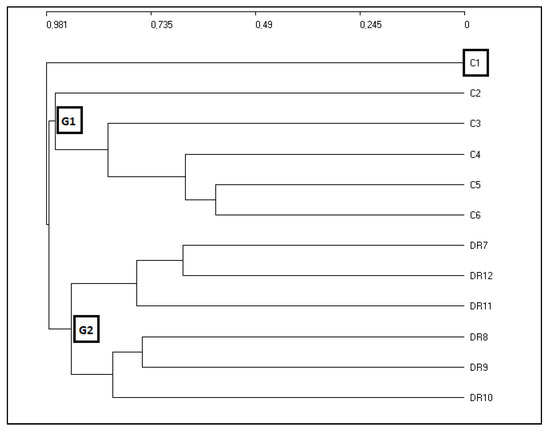 Jaccard distance cluster. Cluster analysis for the associations of Cuba and the Dominican Republic (DR). The six communities described in Cuba by [31,32,33,34,35,36,37] are separated into the community C1 and group G1 (C2, C3, C4, C5, C6). G2 includes 32 of our own relevés and those one of [9,10] from the Dominican Republic (DR) (DR7, DR8, DR9, DR10, DR11, DR12).