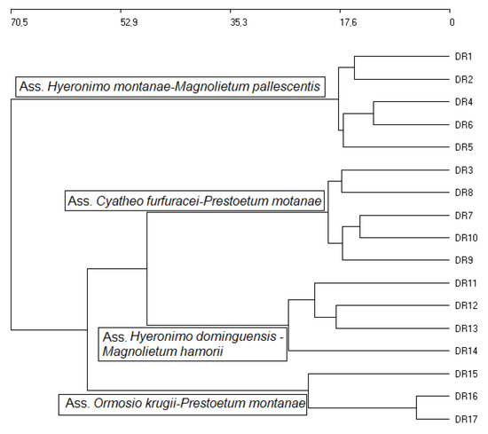 The statistical analysis of the samplings from the DR reveals the existence of four forest plant associations (Figure 2): As1 Hyeronimo montanae-Magnolietum pallescentis nova hoc loco (Appendix A, Table A1, rel. DR1, DR2, DR4, DR5, DR6; typus rel. DR4), growing at altitudes of between 1300 and 1500 m on siliceous substrates in the Cordillera Central range (central biogeographical district), and in rainy environments with a humid ombrotype and a mesotropical thermotype [16,23,38,39]. These forests contact in hyper-humid areas with forests of Prestoea montana (Grah.) Nichol, and have a high floristic diversity with 21 trees, eight climbing species, and five epiphytes, and a high rate of endemisms (14 species); at higher altitudes, above the sea of clouds, the cloud forest of Magnolia pallescens contacts the pine forest of Pinus occidentalis, association Dendropemom phycnophylli-Pinetum occidentalis [22]. As2 Cyatheo furfuracei-Prestoetum montanae nova hoc loco (Appendix A, Table A2, rel. DR3, DR7, DR8, DR9, DR10; typus rel. DR3) is a plant community dominated by Prestoea montana, always found in hyper-humid environments, generally in very rainy and shady gorges, contacting with the previous association towards areas that are somewhat less rainy and more exposed to sun and wind. It also has a high diversity, with 40 tree and 25 epiphyte species. Due to the catenal contact between both associations, As1 and As2 have common species: therefore, they are statistically close (Figure 3). Indeed, the total diversity of the 4 associations is shown in the H’ index values, as well as in the analysis of the phytosociological tables. As3 Hyeronimo dominguensis-Magnolietum hamorii nova hoc loco (Appendix A, Table A3, rel. DR11, DR12, DR13, DR14; typus rel. DR11) represents forests of Magnolia in the Sierra de Bahoruco, which develop on calcareous substrates in humid environments at altitudes of around 1200–1300 m in a humid ombrotype and a mesotropical thermotype, with a high number of tree (25) and epiphyte (14) species; in this case the cloud forest connects with the pine forest belonging to the Cocotrino scopari-Pinetum occidentalis association. As4 Ormosio krugii-Prestoetum montanae nova hoc loco (Appendix A, Table A4 rel. DR15, DR16, DR17; typus rel. DR16), an association characterized by a high diversity of trees (27 species), and a lower number of endemic species than the previous associations. The four associations present a clear floristic and biogeographical differentiation (Figure 4) [17,18,40]. The biogeographic strength and the high floristic and ecological differentiation allow us to establish the four plant associations, despite not having a greater number of inventories. However, these associations present a high number of endemisms, which allows us to treat them as endemic habitats of interest for conservation. In the synthetic analysis (Table 3) the great floristic differentiation between the 4 plant communities can be seen, with the floristic differences among them being 25.7% (As1), 40.6% (As2), 20.7% (As3), and 36.6% (As4): these floristic differences between the 4 associations have been selected from the synthetic table.