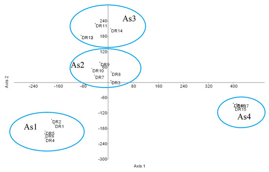 Detrended correspondence analysis (DCA). DCA analysis confirming the separation of the four associations (As1 Hyeronimo montanae-Magnolietum pallescentis; As2 Cyatheo furfuracei-Prestoetum montanae; As3 Hyeronimo dominguensis-Magnolietum hamorii; As4 Ormosio krugii-Prestoetum montanae) found in Dominican Republic (DR) relevés.
