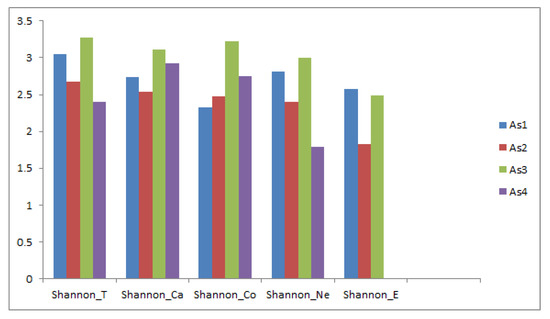 Shannon diversity values (T, Ca, Co, Ne, E) (Shannon_T = total diversity; Shannon_Ca = characteristic community species diversity; Shannon_Co = companion community species diversity; Shannon_Ne = non-endemic species diversity; Shannon_E = endemic species diversity). As1: Hyeronimo montanae-Magnolietum pallescentis. As2: Cyatheo furfuracei-Prestoetum motanae. As3: Hyeronimo dominguensis-Magnolietum hamorii. As4: Ormosio krugii-Prestoetum montanae.