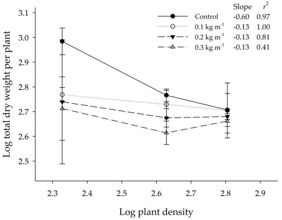 The relationship of log total dry weight per plant vs. log plant density showed that the regression slopes of the investigated treatments of BPr residues deviated from that of the control and the deviation became more apparent as the residue application rate increased (Figure 1). The different reduction between the low and high density treatments showed again that the CR absorbed more phytotoxin per plant at the low density treatment (3 plants pot−1) than at the high density treatments (6 and 9 plants pot−1). Besides, the results also demonstrated that the plant growth might be stimulated at high density due to hormesis (stimulation at subtoxic concentration) at the 9 plants pot−1 treatment [].