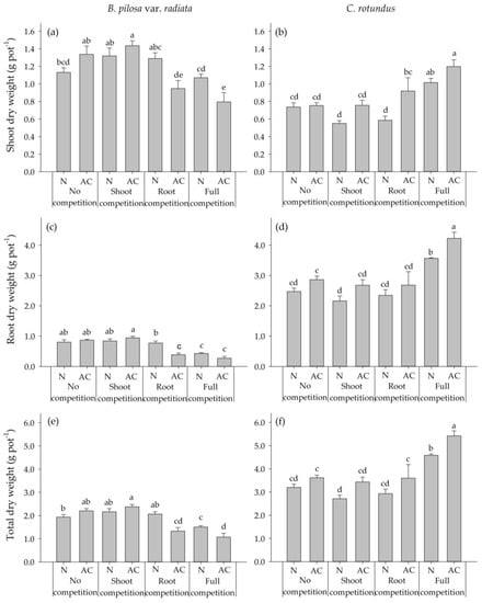 Shoot, root and total dry weight per pot of BPr and CR when grown with two activated carbon application treatments and subjected to four competition modes. (a) Shoot dry weight of BPr. (b) Shoot dry weight of CR. (c) Root dry weight of BPr. (d) Root dry weight of CR. (e) Total dry weight of BPr. (f) Total dry weight of CR. AC and N denoted pots added with and without activated carbon application, respectively. Error bars are the standard error of mean (n = 5). Means with the same letter(s) are not significantly different at 5% level by LSD test.