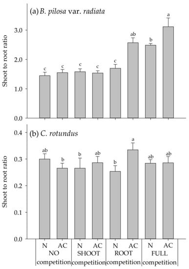 Although both plants are perennial herbs, they had opposite biomass allocation patterns. The biomass distribution was facilitated firstly in shoot rather than in root for BPr, but such distribution occurred in root rather than in shoot for CR at the growing stage. With the NO and SHOOT competitions, neither N nor AC treatment had an effect on the shoot to root ratios of BPr and CR. The average shoot to root ratios of BPr and CR in these competitions were 1.5 and 0.28, respectively (Figure 3).