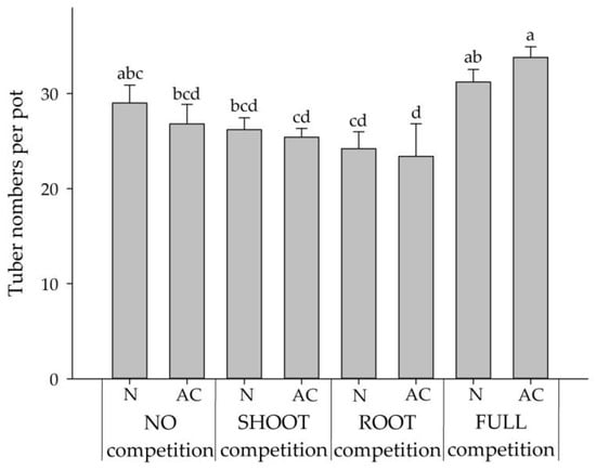 Tuber numbers per pot of CR when grown with two activated carbon application treatments and subjected to four competition modes with BPr. AC and N denoted pots with and without activated carbon application, respectively. Error bars are the standard error of mean (n = 5). Means with the same letter(s) are not significantly different at 5% level by LSD test. Data were square-root transformed prior to analysis.