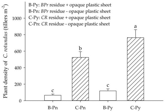 Both of the cover plant treatments were subject to mowing at 69 DAS and all the plant residues were left on their plots. Afterward, for the cover plant of BPr, half of the plots were mulched with the opaque plastic sheet (B-Py treatment) and another half were not (B-Pn). The same handling was conducted for CR. C-Py and CPn treatments denoted the plots mulched with and without the opaque plastic sheet, respectively. Two weeks afterward (i.e., 83 DAS), the investigation of the CR plant density showed that the highest CR density was found at C-Py treatment (764 plants m−2), followed by C-Pn (524 plants m−2), B-Py (118 plants m−2) and B-Pn (65 plants m−2) treatments (Figure 5). According to the results, the treatments grew with BPr and mulched with its residues (B-Py and B-Pn treatments) significantly inhibited the reproduction of CR as compared to that grew without BPr and mulched with the residues of CR (C-Py and C-Pn treatments). The results also further indicated that the reproduction of CR was suppressed by the allelopathy of BPr rather than the opaque plastic sheet. In short, the relationship between the residue dry weight and CR plant density illustrated that the BPr residues could provide suppression on the density of CR even at a lower quantity of 2 ton ha−1 (Figure 6); meanwhile, the CR density was suppressed by 87% on average at the mean application rate of 4 ton ha−1 (Figure 5 and Figure 6).
