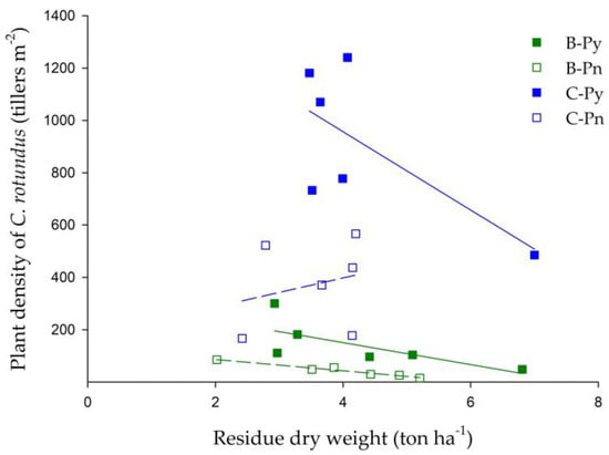 Relationship of plant density of CR (tillers m−2) and residue dry weight (ton ha−1). B-Py is BPr residue covered with the opaque plastic sheet, B-Pn is BPr residue covered without the opaque plastic sheet, C-Py is CR residue covered with the opaque plastic sheet and C-Pn is CR residue covered without the opaque plastic sheet.