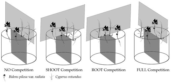 The method used in the interspecies competition was modified from the experimental protocols proposed by Snaydon []. A plastic pot (13.5 cm in diameter and 13 cm in depth) was equally subdivided by a plastic plate to serve as the belowground partition. The plastic plate was sealed with neutral silicone gel to the sides and base of the pot. Another plastic plate of 30 × 30 cm fixed vertically on the upper edge of the pot to serve as the aboveground partition. The relative arrangement of aboveground and belowground partition coupled with the disposition of BPr and CR were designed to compare various competitions, i.e., NO, SHOOT, ROOT and FULL competitions (Figure 7).