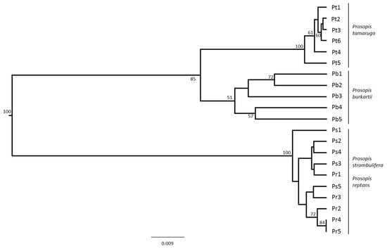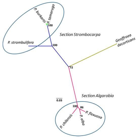 - Bessega, C.; Vilardi, J.C.; Saidman, B.O. Genetic relationships among American species of the genus Prosopis (Mimosoideae, Leguminosae) inferred from ITS sequences: Evidence for long-distance dispersal. J. Biogeogr. 2006, 33, 1905–1915. [Google Scholar] [CrossRef]