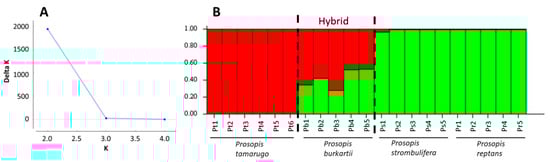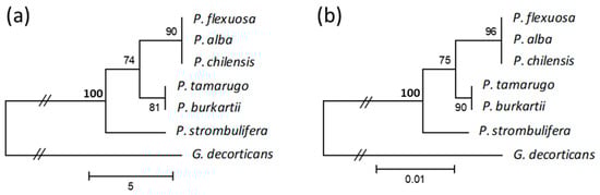 - Saidman, B.O.; Vilardi, J.C.; Pocovi, M.I.; Acreche, N. Genetic divergence among species of the section Strombocarpa genus Prosopis (Leguminosae). J. Genet. 1996, 75, 139–149. [Google Scholar] [CrossRef]