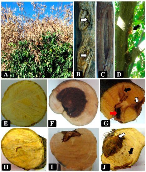 Diversity of external (A–D) and internal (E–I) trunk disease symptoms on Citrus species in Iran (A) a severe dieback on Citrus sinensis; (B) two cankers on a trunk of a C. sinensis tree indicated by arrows; (C) an extended canker on the branch of Citrus aurantifolia indicated by arrow; (D) gummosis on Citrus limetta; (E) cross-section of a healthy branch of C. aurantifolia; (F) central necrosis on C. sinensis; (G) Co-occurrence of brown wood streaking (black arrow), wedge-shaped necrosis (white arrow) and irregular wood necrosis (red arrow) on C. sinensis; (H) Arch-shaped necrosis on C. aurantifolia; (I) a young wedge shaped necrosis on Citrus reticulata; (J) Co-occurrence of wedge-shaped necrosis is indicated by the white arrow and black spots are indicated by the black arrow on the C. sinensis.