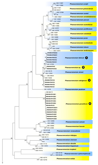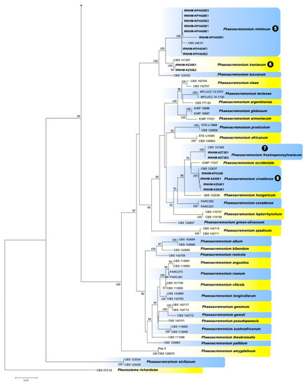 Datasets of the BT and actin (ACT) alignments of Phaeoacremonium were congruent and could be combined (p = 0.225). The Hasegawa–Kishino–Yano model (HKY) with gamma distributed with invariant sites rates (G+I) was identified as the BIC best-fit nucleotide substitution model by the jModelTest for the Phaeoacremonium multi-locus analysis. Maximum likelihood (ML) of the combined ACT-BT regions provided a phylogeny with 98 to 100% ML bootstrap support for all species-level clades, with the exception of P. alvesii (paraphyletic, 87% bootstrap support), P. griseorubrum (paraphyletic, 66% bootstrap support), P. roseum (89% bootstrap support), and P. viticola (paraphyletic with regard to P. roseum and P. angustius) (Figure 2). The 39 strains from Iran clustered in eight clades (P. italicum, Phaeoacremonium sp., P. rubrigenum, P. parasiticum, P. minimum, P. iranianum, P. fraxynopennsylvanicum, and P. croatiense). The isolates of the clade 2 grouped together in a polyphyletic clade with 100% bootstrap support with the P. italicum as a closely related species. The BT and ACT sequences of the second clade of Phaeoacremonium isolates were 98% (BT) and 98.77% (ACT) identical to those of P. italicum CBS 137763 (GenBank KJ534074, KJ534046). Three nucleotides varied in the ACT region and ten nucleotides in the BT region between the second clade of Phaeoacremonium isolates and the P. italicum CBS 137763 sequences.