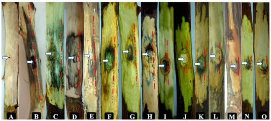 Pathogenicity tests of fungal species inoculated onto Citrus aurantifolia detached shoots, 40 days after inoculation: (A) control; (B,C) Lasiodiplodia theobromae; (D); Dothiorella viticola; (E) Neoscytalidium hyalinum; (F,G) Phaeoacremonium parasiticum; (H) Cadophora luteo-olivacea; (I) Phaeoaremonium minimum; (J) Phaeoacremonium iranianum; (K) Colletotrichum gloeosporoides; (L) Phaeoacremonium fraxinopennsylvanicum; (M) Phaeoacremonium italicum; (N) Stilbocrea walteri; (O) Phaeoacremonium rubrigenum; (white arrows show the point of inoculation, and the red dashed lines indicate the lesion length caused by each isolate).