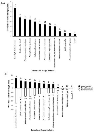Mean lengths of wood discolorations caused by inoculated isolates obtained from Citrus species on the detached shoots of C. aurantifolia are shown in Figure 3 and Figure 4. Our results showed a variation in the total (Figure 4a), and both the upward and downward lesion lengths (Figure 4b) from the point of inoculation and re-isolation frequencies of inoculated isolates on lime shoots. L. theobromae was the most aggressive fungal species and produced the longest necrotic lesions (57.67 mm) on the inoculated shoots followed by Do. viticola (38.17 mm) and P. parasiticum (34.33 mm) (Figure 4a). In contrast, two species of S. walteri (6.33 mm) and P. rubrigenum (6.00 mm) produced the smallest wood lesions on the inoculated shoots, and no significant differences were observed between these species and the control treatments (3.67 mm).