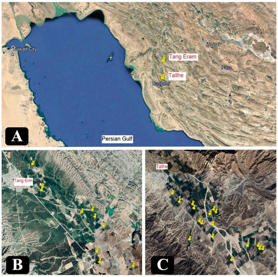 (A) Location of the Bushehr province. Two Citrus growing regions were surveyed, Tallhe and Tang Eram. (B) Location of surveyed orchards in the Tallhe region. (C) Location of surveyed orchards in the Tang Eram region.