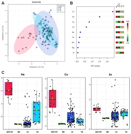 PLS-DA scoreplot (A), importance of variables ranked by VIP (Variable Importance in Projection score) (B) and box plot for the discriminant elements (C) obtained for soil samples, with a VIP score > 1. (Figure 1B: the colored boxes on the right indicate the relative increase/decrease of the corresponding variable in each group). BAT: Barletta-Andria-Trani; LE, BR, TA: Lecce, Brindisi, Taranto provinces (Apulia); PZ Potenza province (Basilicata, Apulia bordering region).