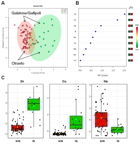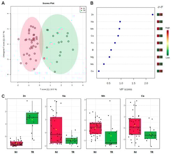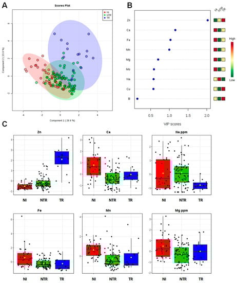 PLS-DA scoreplot (A), importance of variables ranked by VIP (Variable Importance in Projection score) (B) and box plot for the discriminant elements (C) obtained for olive leaf samples. (Figure 2B: the colored boxes on the right indicate the relative increase/decrease of the corresponding variable in each group). TR (farm treated with zinc–copper–citric acid), NTR (farm not treated and infected by Xylella fastidiosa subsp. pauca) and NI (farm not infected by Xylella fastidiosa subsp. pauca).