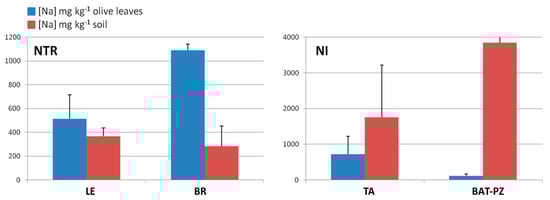 Mean concentration of sodium (Na, mg kg−1) within olive tree leaves obtained for infected-not treated (NTR) and not-infected (NI), and the corresponding soil sample sites.