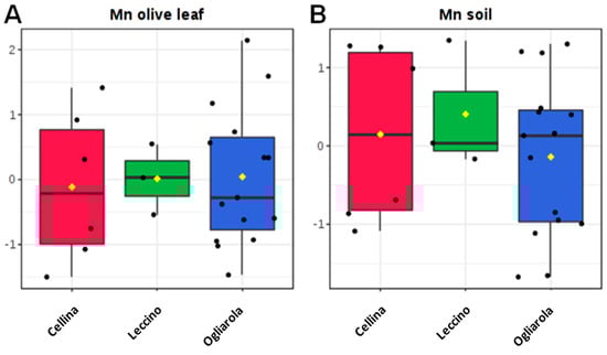Box plots concentration for manganese olive leaf (A) and soil (B) samples of infected olive trees of Cellina di Nardò, Leccino and Ogliarola salentina cultivars, located in Taranto province (see also Table 1).