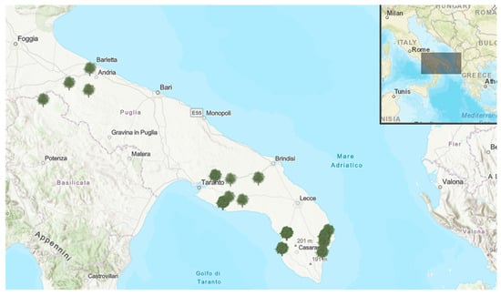 Xylella fastidiosa is a plant pathogenic bacterium that causes damage to many crops, mainly in North, Central and South America. Recently, this quarantine phytopathogen has enlarged its distribution by reaching several European countries and infecting both cultivated and wild plants [1]. X. f. subsp. pauca is responsible for the “olive quick decline syndrome” (OQDS) in the Salento area (Apulia region, southern Italy) [2]. Currently, it is estimated that about 6,500,000 trees are infected by this bacterium [3]. The main symptoms are leaf, twig, and branch wilting, followed by the death of the plant. The pathogen was, most probably, introduced in the area from Central America through the circulation of infected Coffee plants [4,5]. So far, a single clonal lineage of this subspecies, namely the sequence type 53, is associated with OQDS in all infected areas of Salento [6,7]. According to the European quarantine legislation, three areas have been established for a better management of the disease: (1) the “infected” area where the pathogen is spread and the eradication measures are not feasible (i.e., the southernmost area of the Salento peninsula); (2) the “containment” area that borders the “infected” one and where infected olive trees must be uprooted; (3) the “buffer” area where, within a radius of 100 m [8,9] that starts from the infected tree, all olive trees must be uprooted. Debatably, in future, the length of this radius could be reduced [10]. The last two areas are surveyed and monitored by the regional phytosanitary service for assessing the occurrence of the pathogen [11]. The area north of the “buffer” is retained and declared “free” from the pathogen upon the surveys and laboratory analyses performed by ad hoc Institutions of Apulia Region.