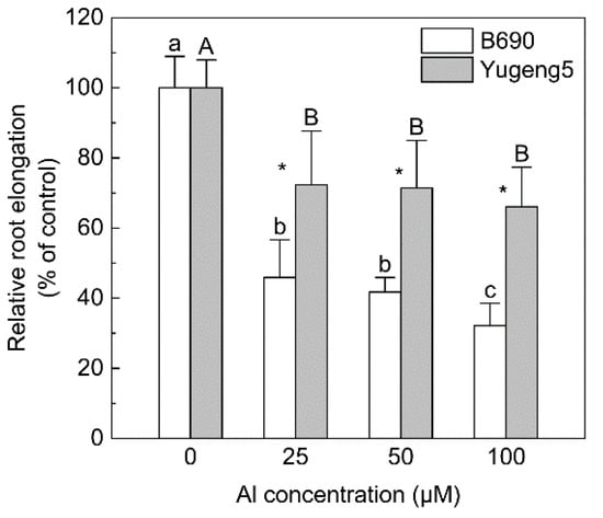 2.1. Comparison of Al Tolerance between Two Rice Cultivars