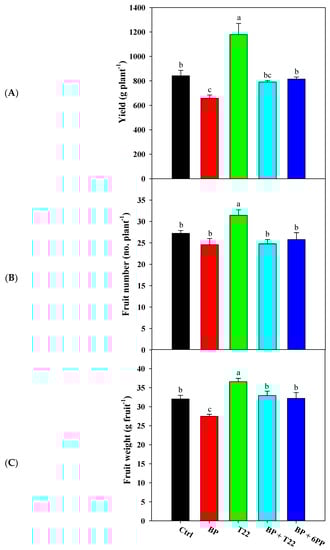 Effects of Trichoderma harzianum strain T22 (T22) or biopolymer (BP) applications alone, or in combinations of BP + T22 or BP + 6-pentyl-α-pyrone [6PP] (BP + 6PP), on fresh yield (A), fruit number per plant (B) and mean fruit weight (C) of greenhouse plum tomato. The control was not treated with biostimulants (Ctrl). Values are the means of three replicates ± SE. Different letters indicate significant differences according to Duncan’s test (p = 0.05).