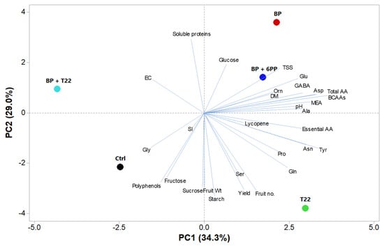 Principal component loading plot and scores of principal component analysis (PCA) of morphological parameters, starch, soluble carbohydrates, polyphenols, lycopene and soluble protein and amino acid profiles of greenhouse tomato as affected by different treatments: Trichoderma harzianum strain T22 (T22) or biopolymer (BP) alone or in combination (BP + T22 or BP + 6PP). The control was not treated with biostimulants (Ctrl).