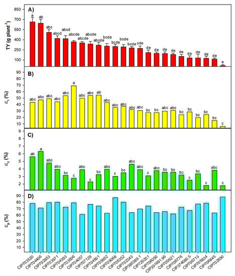 Adjusted mean values of TY—dry tuber yield per plant (A); —radiation interception (B), —conversion (C) and —partitioning efficiency (D) per accession. Different letters mean significant differences (p-value < 0.05) among them, according to a Tukey test. There were no significant differences (p-value > 0.05) for .