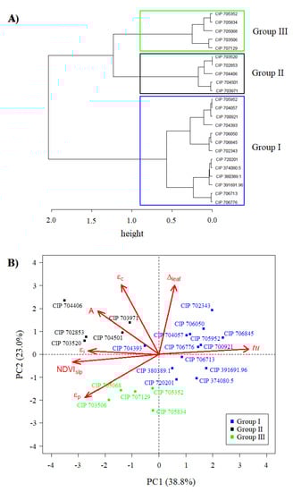 Hierarchical clustering using Ward’s method (A). Accessions ordination based on principal component analysis for physiological (A, ), radiation-related (, , ), senescence delay () and tuberization precocity () parameters (B). See abbreviations in Table 3.