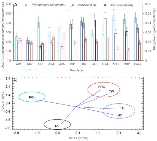 Tolerance of native rootstocks of P. americana to P. cinnamomi and Verticillium sp., and graft compatibility with cv. Hass. (A) AXN, morphotype of Persea americana var. americana (West Indian-type race); GXN, morphotype of Persea americana var. guatemalensis (Guatemalan-type race); MXN, morphotype of Persea americana var. drymifolia (Mexican-type race); RRI, relative rate increase (g day−1); AUDPC, area under disease progress curve; error bars represent the confidence intervals of the mean, validated by the Tukey mean separation test and no overlapping of the error bars indicates significant differences (p < 0.05); (B) Clustering of genotypes based on evaluated agronomic variables. RPC, resistance to P. cinnamomic; TW, tolerance to waterlogging; HRD, high rate of developed under extreme soil moisture; TD, tolerance to drought; GC, graft compatibility with cv. Hass genotype; RV, resistance to Verticillium sp.