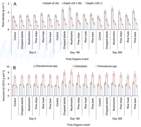 Root densities (A) and rhizosphere microorganism populations (B) measured after the addition of organic mulch in avocado plants. Error bars represent the confidence interval of the mean, validated by the Tukey mean separation test. No overlapping of the error bars indicates significant differences (p > 0.05).
