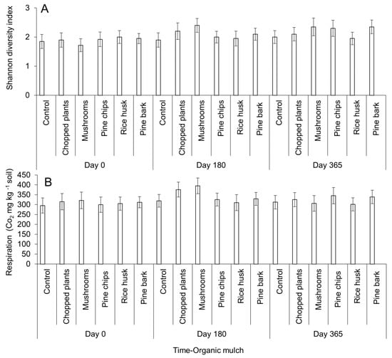 Microbial diversity (A) and microbial activity (B) values after the addition of organic mulch in avocado plants. Microbial diversity was calculated using the Shannon index. Microbial activity is proportional and represented as respiration values. Error bars represent the confidence intervals of the mean, validated by the Tukey mean separation test. No overlapping of the error bars indicates significant differences (p > 0.05).