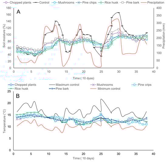 Dynamics of soil moisture (A) and temperature (B) within the soil profile through time as a result of the addition of organic mulch in avocado plants.