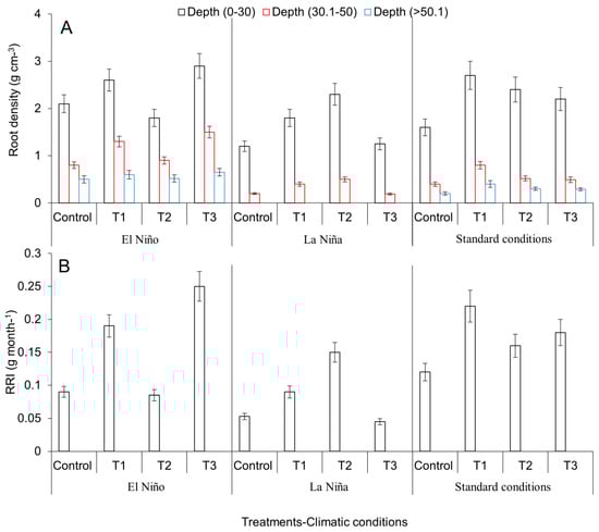 Significant differences of RRI and root density values were observed between treatments tested under the ENSO and standard climatic conditions (p < 0.05). During El Niño, root density of the native rootstock T3 significantly (p < 0.05) increased 38.0 and 87.5% at a depth of 0–30 and 30.1–50 cm, respectively as compared with the control. Values observed for T3 were followed by those observed for rootstock T1. No significant differences (p > 0.05) were observed between the control and rootstock T2. Meanwhile, during La Niña, rootstock T2 showed an outstanding increment in root density of 91.6 and 50% at a soil depth of 0–30 and 30.1–50 cm, respectively as compared with the control (p < 0.05). During standard climatic conditions, rootstock T1 showed the highest increase in root density of 68.7 and 58.3% at a soil depth of 0–30 and 30.1–50 cm, respectively as compared with the control (p < 0.05) (Figure 5A). Similarly, the variable RRI showed the highest values for treatments T3 during El Niño, T2 during La Niña, and T1 during standard climatic conditions (p < 0.05) (Figure 5B).