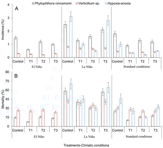 Variation in incidence (A) and mortality (B) values of avocado wilt disease induced by major causal agents after agronomical practices aimed to mitigate the adverse effects of the ENSO phenomenon (El Niño and La Niña) under field conditions. T1, new tools (plants with genetic identity, free of pathogen and root damage and planted under conditions of low alteration of the micro-drainage networks) implemented under field condition and the native genotype with the best performance to waterlogging, drought, graft compatibility, and resistance to P. cinnamomi and Verticillium sp.; T2, practices implemented in T1 + the native genotype with the best performance under waterlogging conditions; T3, practices implemented in T1 + the native genotype with the best performance under drought conditions; Control, traditional system implemented in avocado producing farms. Error bars represent the confidence interval of the mean, validated by Dunnett’s, and Tukey–Kramer separation tests. No overlapping of the error bars indicates significant differences (p > 0.05).