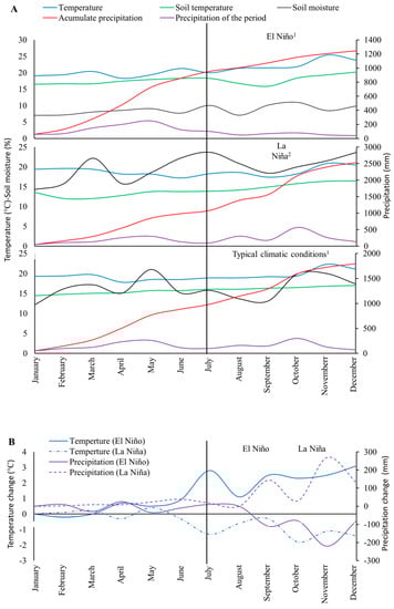 Climatic conditions under ENSO phenomenon (El Niño-La Niña) and typical standard conditions in the regions where experimental plots of avocado crops were located. (A) Temporal variation of climatic variables in the lots evaluated. 1 Soil moisture (real value/5) and 2 Soil moisture (real value/7); (B) Change in climatic variables under ENSO phenomenon.
