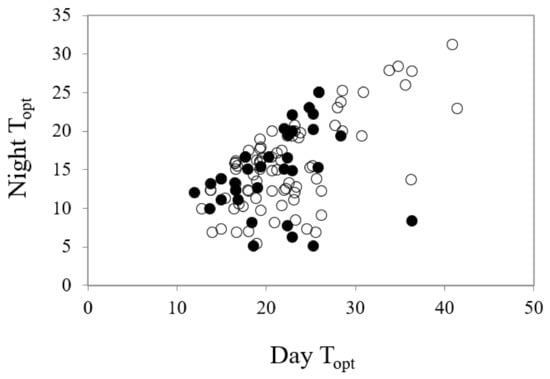 The relationship between the diurnal temperature conditions (°C) required for highest and most rapid germination (Topt—optimum temperature for germination) in common (○, r2 = 0.4384) and restricted species (●, r2 = 0.088) from southern Western Australia.