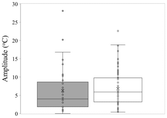 Box and whisker plot showing the amplitude of temperature fluctuations for optimum germination performance in common (□) and restricted species (■) from southern Western Australia. The X represents the mean, the horizontal line is the median, upper and lower boundaries of the box represent the interquartile range (75th and 25th percentiles), and whiskers extend from maximum to minimum.