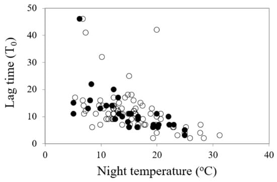 A comparison of the relationship between time to commence germination (lag time, T0) and night temperature for most rapid and highest germination in common (○) and restricted species (●) from southern Western Australia.