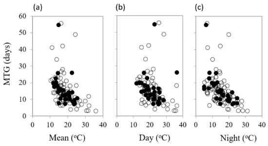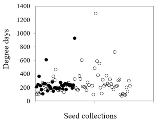 The temperature parameters for germination (diurnal temperatures, their mean and amplitude) for each collection across the 49 incubation cells were logged and recorded. Germination percentage and rate measurements were calculated for each cell where germination occurred and included the lag time (i.e., days to first germination, T0), time to reach 50 percent of final germination (T50), and its reciprocal (1/T50, germination rate) and the mean time to germination (MTG days). MTG was calculated for the treatments that gave maximum germination using the equation: MTG = Σ (n × d)/N, where n is the number of seeds germinated between scoring intervals; d is the incubation period in days at that time point; and N is the total number of seeds germinated. From this dataset, only the information from the cell that elicited the most rapid and highest germination (termed optimum temperature for germination, Topt) for each collection was used in the analyses. In reporting the optimum thermal requirements for germination, I have ignored temporal patterns of germination as germination patterns were not compared within a species, rather between species. The mean of the diurnal temperatures was used as an indicator of season of germination as well as being a good index of biological activity []. Speed of germination is driven by accumulated temperature, or degree-days. In its most simplified form, degree-days are the sum of the average daily maximum and minimum temperatures over consecutive days (e.g., 12 h at 10 °C and 12 h at 25 °C equate to a mean of 17.5 °C multiplied by the germination rate in days). In this research, I calculated degree days as the mean diurnal temperature multiplied by the time to 50% germination in days. The concept of degree days is based on the hypothesis that the rate of germination increases in a linear manner with temperature to a point considered to be the optimal temperature for germination []. Further increases in temperature can reduce both the germination rate and the germination capacity to zero and would be considered as supra-optimal for germination. Seed weights were determined based on three replicates of at least 50 seed per species, and the number of seeds per gram was subsequently calculated for each collection.