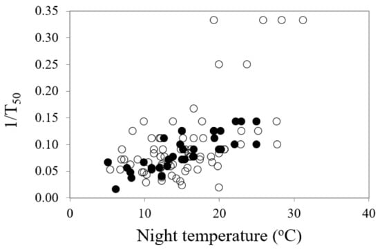 Mean temperature for optimum germination (Topt) had a significant influence on mean time to germination (MTG) (df = 1, 111, F = 20.68, p < 0.001) (Table 2). As various temperature parameters of the diurnal cycle increased, the mean time to final germination reduced, but there were some differences in the responses between common and restricted species (Figure 4a–c). Night temperature was also a highly significant (df = 1, 109, F = 59.75, p < 0.001) driver on time to 50% germination (germination rate, 1/T50), accounting for over one third of percentage variance in response. Restricted species showed a greater response to night-time temperature (Figure 5).