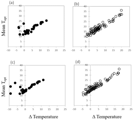 The difference (Δ) in observed mean temperature for optimum germination (empirical data) and current (1970–2000) temperature in the wettest quarter plotted against the mean temperature for optimum germination (Topt) for (a) restricted species and (b) common species. Fourteen collections are within 1 °C or below of the mean optimum temperatures for germination of the current wettest quarter. By 2061–2080, 50 collections are predicted to be within 1 °C or below threshold mean temperatures for germination in the wettest quarter (c) restricted species and (d) common species.