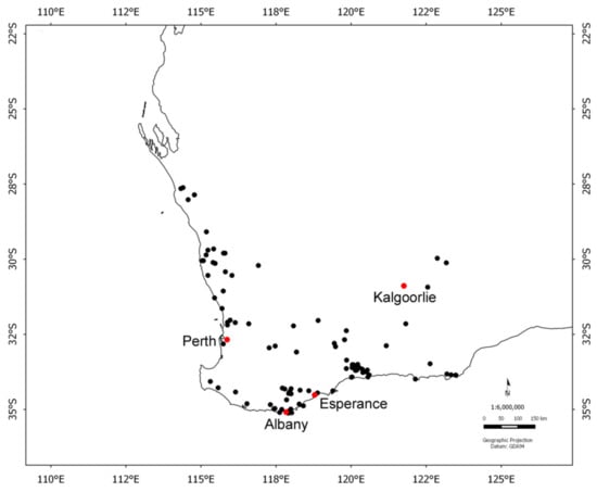 Locations of species investigated from southern Western Australia.